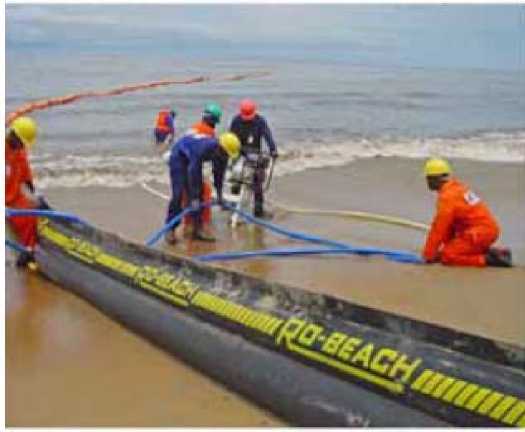 response teams using equipment such as booms and skimmers from a cache of spill response equipment. The lengths of boom, designed to contain oil floating on water, were deployed at critical locations, as designated in the “Project’s Area Specific Oil Spill Response Plan”. Specially designed inflatable boom was deployed across the surf line. Boom was also strung across the mouth of a river.