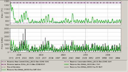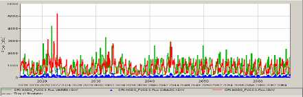 Table 3 represents the plots of elevation, flow and power production at the Temenos dam in conditions of full flow and climate change. Of course in the case of the NODO alternative only the flow plot is available. There are not many visible differences between the TDELT and the TDELX alternatives: a further more precise analysis can be done if needed. Comparing the TDELT/TDELX alternatives to the DOALL alternative, the interval of values reached is similar – due to the definition of the dam exploitation –, but the number of episodes where the level of the dam lake decreases low down its optimal level is bigger in the DOALL alternative. This means that the critical situations, where the dam will not have enough water to provide the natural delta, the irrigations, and the pumps for Platanovrisi and its own turbines, are more numerous in the DOALL alternative than in the others: this could jeopardize the viability of the project.