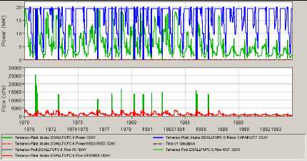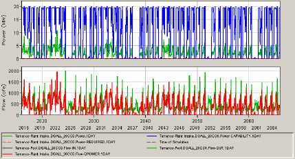 Another comment to understand the meaning of plots of Tables 1 to 3 is that the simulations that are represented are done with the initial hypothesis that the dams are full at the beginning of the simulation. Of course, in a real situation this is not possible: on one hand, the Temenos dam being built, it will have to be filled first, and on the other hand nothing assures that, when the Temenos dam will be launched, the other two already existing dams will be at their top level.