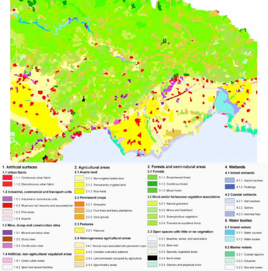 For European countries, the European Environment Agency (EEA) has developed a common classification – the Corine Land Cover (CLC) – updated in 2000 with satellite imagery. The grid is made of 25 hectares cells and the information is defined in 44 classes. Figure IV.1 shows an illustration of the information provided by CLC for the Temenos project area.