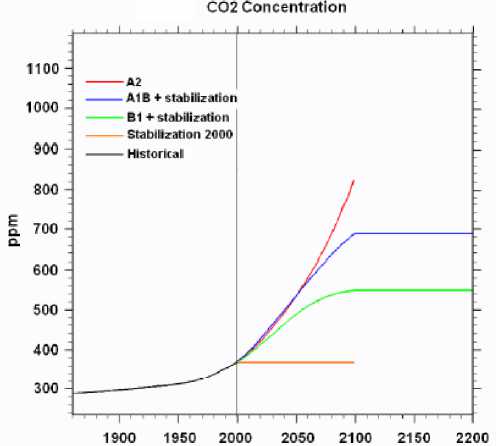Scientists working all around the world, gathered in the Intergovernmental Panel on Climate Change (IPCC) group of the United Nations Environment Programme (UNEP), have developed several future scenarios of the evolution of climate at a planetary scale due to humans activities. Those simulations are established upon given evolution of CO2 (ref. Figure IV.3), NO2, CH4 or SO2 emissions. Several members of IPCC give access to their simulation results.